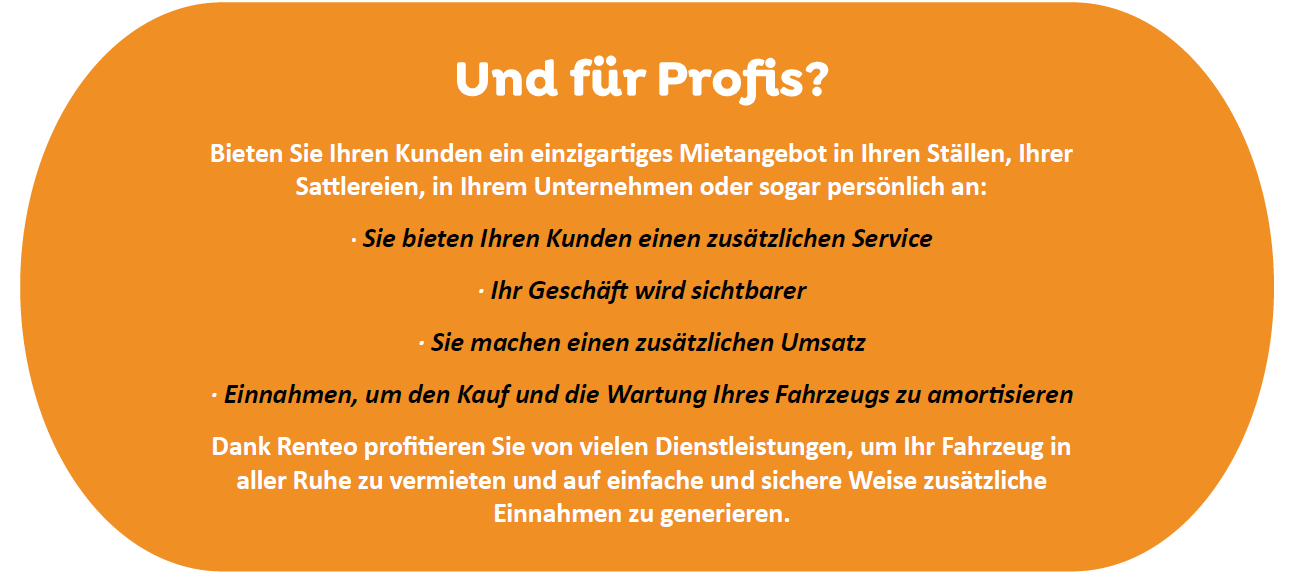 Um möglichst viele Pferdeleute in meiner Umgebung aufmerksam auf mein Mietfahrzeug zu machen, wirbt Renteo auf sozialen Netzwerken (FB, IG), Suchmaschinen (Google) und auf Turnieren bundesweit. Abgesehen davon bekomme ich auch als Renteo-Vermieter einen kostenlosen Werbekit mit Flyers (oder mehr Online Werbung auf Wunsch), die ich in den nächstgelegenen Reitvereinen oder Ställen auslegen kann. Ich soll ja meine Kunden gewinnen!